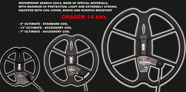 We have the pleasure to introduce to you our newest VLF detector - CHASER. This is the best detector in its class. The new CHASER detector combines: - the best sensitivity and depth of detection - extremely stable operation - excellent discrimination It is intuitive, extremely easy for operation: - with a choice of a MENU with 5 languages – English, French, Russian, Spanish, Turkish. - and HELP option in each of the languages to facilitate the operator. With its 14 kHz operating frequency this all-terrain detector is useful for whatever type of search – coin shooting, relic hunting, nugget hunting, beach hunting… - 180 precise VDI numbers - ID band on the display, showing the conductivity of the different targets, indicating the chosen degree of discrimination - Easily adjusted discrimination levels - Four preset discrimination programs: DISC ZERO, RELIC, COINS, BEACH. - Choice of three audio modes of operation: - ONE TONE - DUAL TONE (MIXED) - Tone Identification (MULTITONE) - Accurate PIN-POINT – with audio and visual indication - Easily used MENU, consisting of 6 functions, depicted with intuitive ICONS: - Sensitivity - Volume - High/Low GAIN - Tone - Frequency - Memory- the detector could save your lastly used adjustments - FIXED Ground Balance – possibility of operation using MANUAL or AUTOMATIC Ground Balance settings. - Built-in LED indicators for lighting the coil and the area in front of the operator – for night hunting - High Resolution 256 x 160 Pixels Display with built-in lighting - The CHASER is standardly equipped with 9”Ultimate Searchcoil. Accessory Searchcoils – 7” and 13” Ultimate Searchcoils. All the searchcoils are made of fibre-glass enforced material, super light and strong. Waterproof and Shock-resistant. All of them coming with coil covers of special, scratch-resistant material. - Real telescopic arbon-fibre shaft, super light and super strong! With stepless adjustment of the handle. Allows detector operation by very tall, and very short users. Its extended length is 1450 mm (7 inches). When collapsed to transport form its length is 740 mm (29 inches). - Standardly equipped with four Ni-MH rechargeable batteries system, ensuring more than 20 hours of continuous operation. - 1/8”stereo headphones input - Optional Headphones and Wireless Headphones Excellently balanced detector with overall weight (including the batteries) of only 1.5 kg (3.31 lbs).